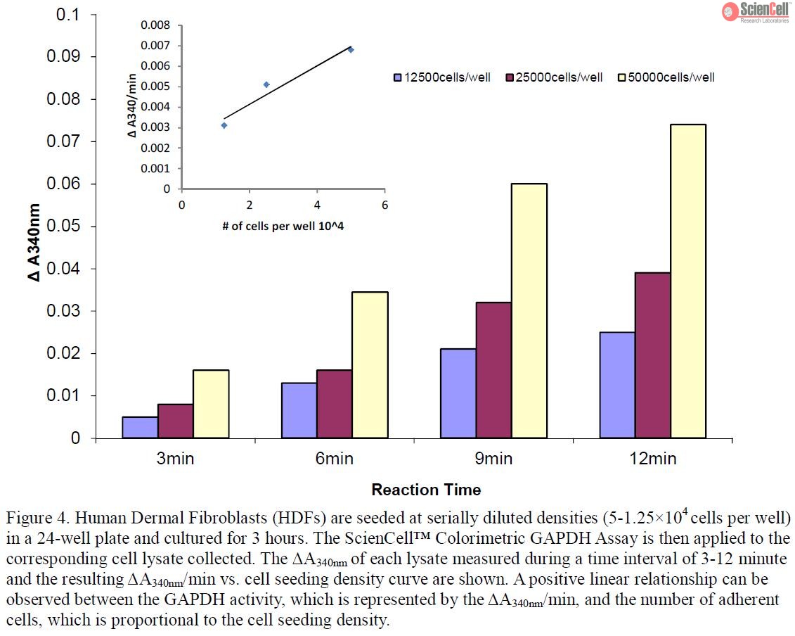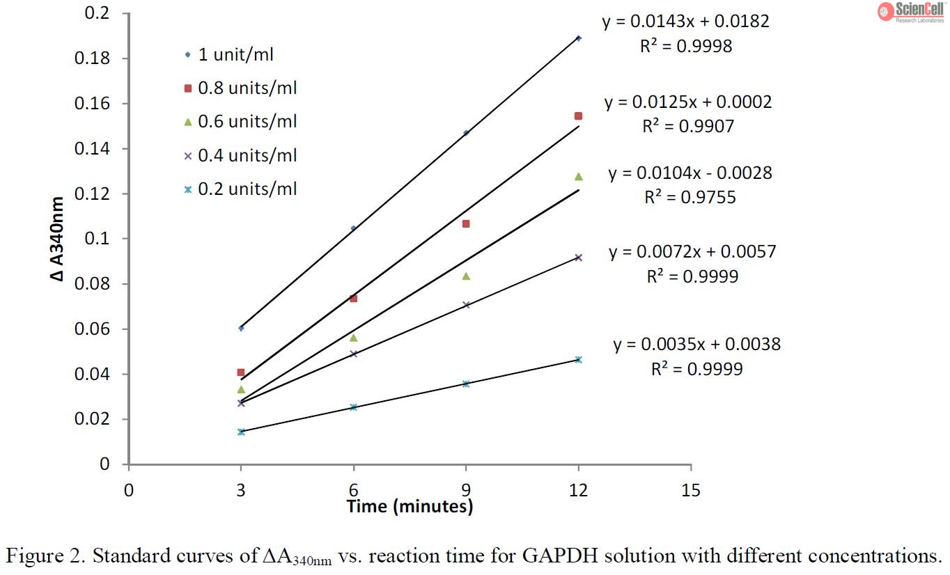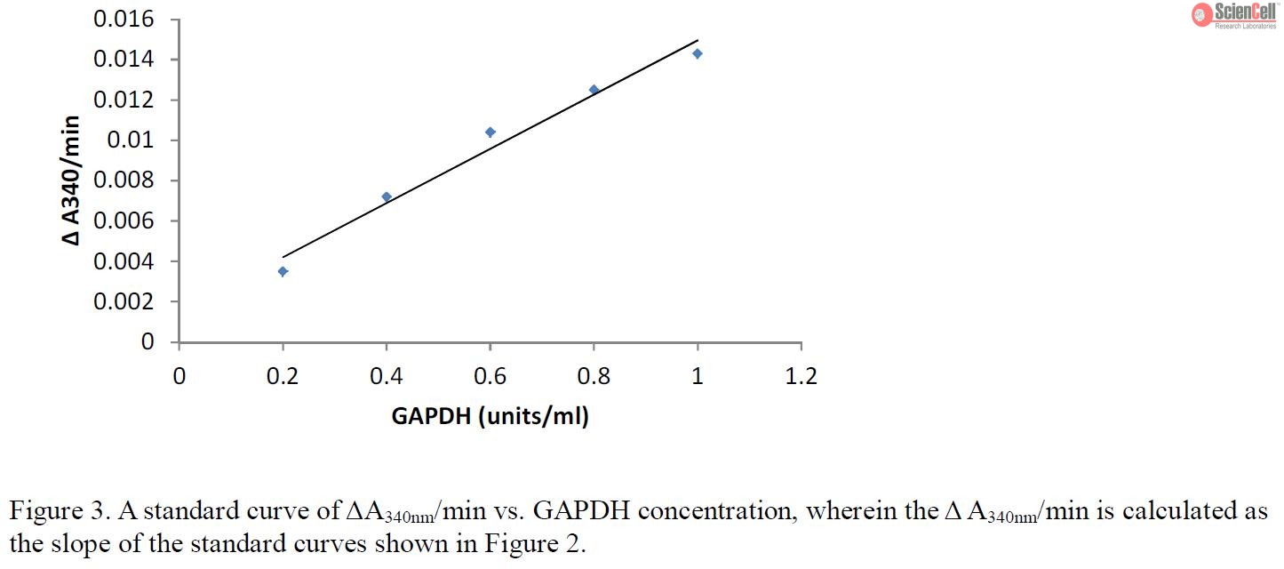 甘油醛-3-磷酸脱氢酶(GAPDH)是催化糖酵解的四聚体酶,因此用于分解葡萄糖的能量和碳分子。由于GAPDH基因以相对恒定的水平普遍表达,因此被广泛用作RNA和蛋白质分析的内部对照。ScienCell比色GAPDH测定提供了一种非放射性方法,用于测量培养细胞中GAPDH的酶活性,基于在3-磷酸甘油酸(3-PGA),腺苷5存在下β-NADH氧化成β-NAD。'-三磷酸(ATP)和GAPDH。通过测定NADH氧化速率来确定GAPDH活性,该速率与340 nm处随时间的吸光度降低成正比(ΔA340nm/min)。