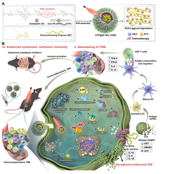 卵巢癌因其高度易发生腹部转移、复发以及免疫抑制性肿瘤微环境的存在,仍是一大治疗难题。为克服这些障碍,作者开发了自组装纳米平台(OSN),将近红外半导体聚合物与草沙铂(IV)前药整合。这一多功能设计使得光热疗法(PTT)、光动力疗法(PDT)和化疗在单一纳米颗粒内协同,有效增强免疫原性细胞死亡(ICD)和系统性抗肿瘤免疫。激光照射时,OSN生成局部高热和活性氧。这些效应协同增强了草沙利铂的活化和肿瘤穿透,同时通过半胱天冬酶1介导和半胱天冬酶3依赖的双重途径触发缓溶。这种强健的灼食反应增强了损伤相关分子模式(如ATP、HMGB1)和促炎细胞因子(如IL-18、IL-1β)的释放,从而重塑免疫抑制微环境,促进树突状细胞成熟,并促进细胞毒性T细胞浸润。在小鼠卵巢癌模型中,OSN实现了超过90%的肿瘤抑制率,显著优于单药治疗。值得注意的是,该纳米平台建立了长期免疫记忆,有效降低肿瘤复发风险。通过同时针对免疫屏障和多模态机制转移进展,OSN代表了一种具有高度临床可迁移性的范式策略,用于治疗侵袭性卵巢恶性肿瘤。