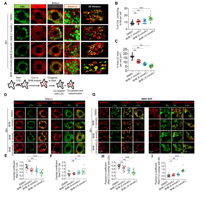 图3.BHB促进棕色脂肪细胞中的线粒体脂滴接触。