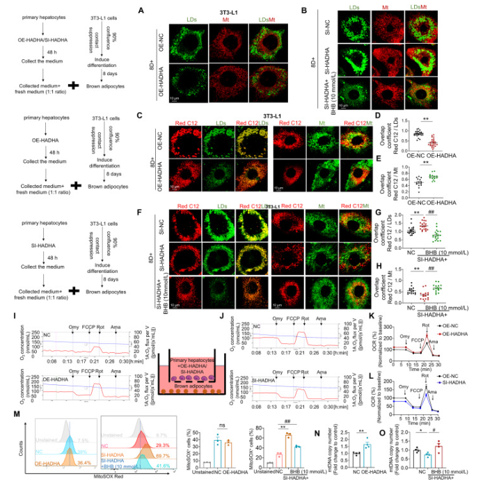 (A)在HADHA对原级肝细胞的过度表达后,收集其培养基,并与从3T3-L1细胞诱导的成熟棕色脂肪细胞共培养48小时。成熟棕色脂肪细胞的线粒体通过Mitotracker红色染色和脂滴通过BODIPY染色可视化。每组中 n = 13。(b)在HADHA敲低原级肝细胞后,收集其培养基,并与3T3-L1细胞诱导的成熟棕色脂肪细胞共培养48小时。成熟棕色脂肪细胞的线粒体通过Mitotracker红染色和脂滴通过BODIPY染色可见。每组中 n = 20。(C–E)在原级肝细胞中HADHA过度表达后,其培养基被收集并与3T3-L1细胞诱导的成熟棕色脂肪细胞共培养,C12检测到棕色脂肪细胞FA,线粒体用Mitotracker Green染色,脂滴用BODIPY染色。FA定位于线粒体或FA定位于LDs的统计数据。