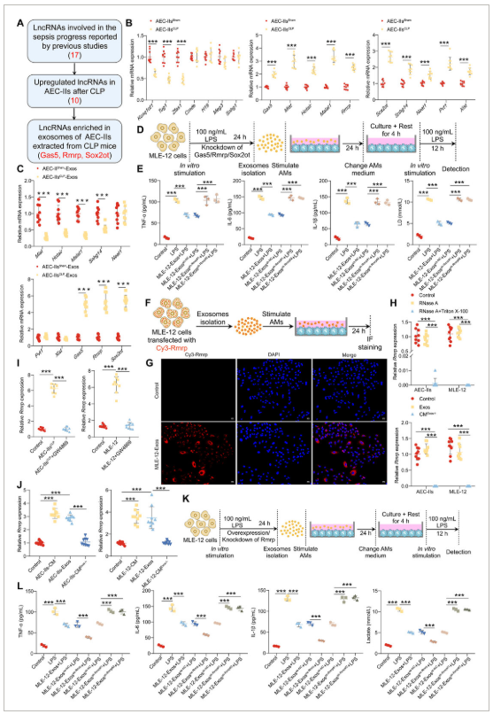 A)流程图,概述了调控AMs糖酵解和免疫反应的AEC-II衍生外泌体中候选lncRNA的筛选过程。B)对来自假或CLP小鼠的AEC-II中lncRNA表达进行逆转录定量PCR(RT-qPCR)分析(n=9/组)。E) 接受MLE-12细胞来源外泌体并随后用LPS刺激的AMs上清液中TNF-α、IL-6、IL-1β及乳酸水平的ELISA(n=3/组)。G)结合MLE-12细胞中Cy3标记外泌体孵育的AMs代表性荧光图像。尺度条:25微米高时,对用RNase A或Triton X-100处理的AEC-II或MLE-12细胞中CM中的Rmrp进行RT-qPCR分析(上方面板),以及AEC-II或MLE-12细胞(下组)CM或外泌体中的Rmrp表达(n=9/组)。I) 对AMs与AEC-II(左)或MLE-12细胞(右)共培养的AMs中Rmrp进行RT-qPCR分析(n=9/组)。J) 用CM或来自AEC-II细胞(左)或MLE-12细胞(右)的外泌体处理AMs的Rmrp RT-qPCR分析(n = 9/组)。L) 在与MLE-12细胞来源外泌体共培养及后续LPS刺激后,AMs上清液中TNF-α、IL-6、IL-1β及乳酸水平的ELISA(n=3/组)。数据以均值±标准差(SD)呈现。