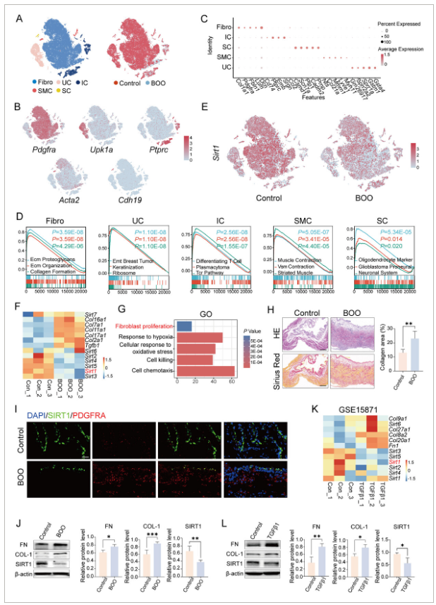 L)验证TGF-β1处理后培养小鼠膀胱成纤维细胞中SIRT1抑制作用。