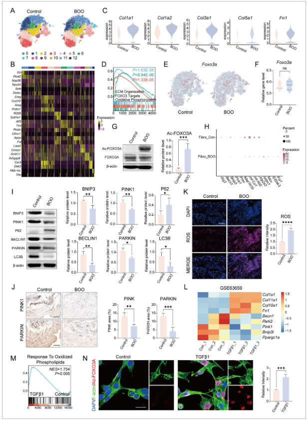N) 免疫荧光验证确认,TGF-β1处理后小鼠膀胱成纤维细胞中的FOXO3A乙酰化增加(尺度条=25微米)。