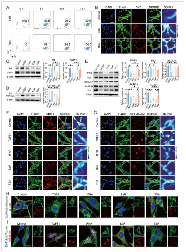 A)在治疗后3、6和12小时评估小鼠膀胱成纤维细胞中Cy5标记的SaR和TSA复合物的细胞摄取效率。(E) 培养小鼠膀胱成纤维细胞中关键线粒体调节因子(PINK1、BECLIN1、PARKIN、LC3)。(G)FOXO3A乙酰化的代表性免疫染色和热分析(尺度条=25微米)。